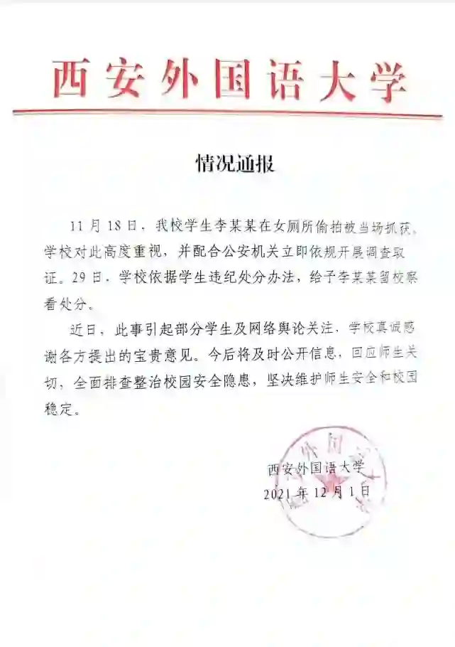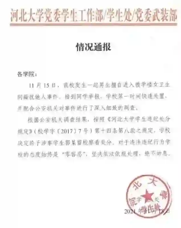 12月7日,四川大学研究生院网站发布情况通报:2021年12月5日晚,四川大学文学与新闻学院一男生在江安校区文科楼6楼女卫生间偷拍被现场挡获。学校对此事件高度重视,立即成立专项工作组,配合公安机关依法依规开展调查工作。经查,该生严重违纪,依据学校学生纪律处分相关规定,经学校研究决定,给予该生开除学籍处分。全文如下: