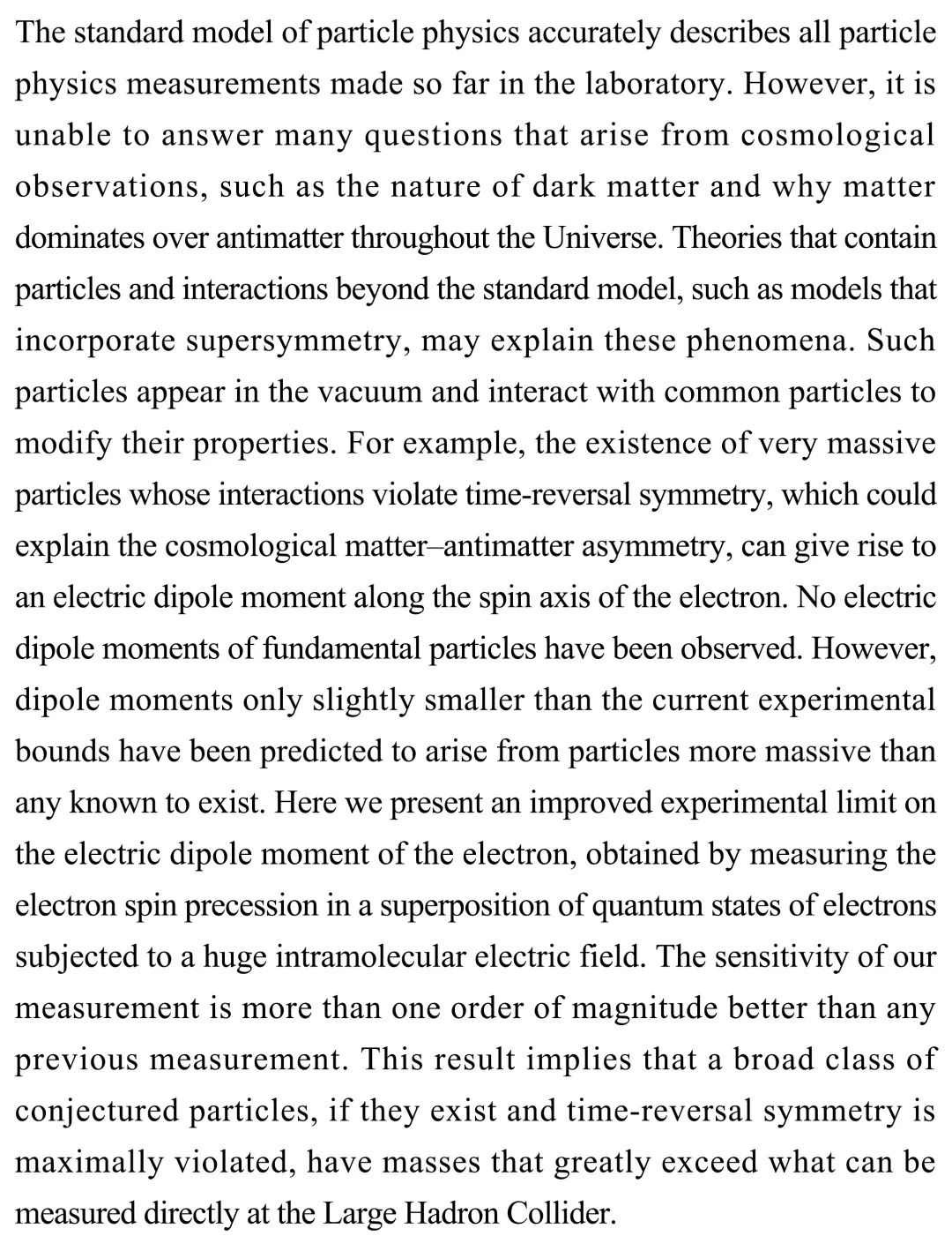 (导读 阿金)粒子物理学的标准模型可准确描述目前实验室内粒子物理学测量结果,但尚未能解释宇宙中观测到的问题。本研究通过测量电子在巨大的分子内电场下量子叠加态的电子自旋进动,改进了电子偶极矩测量的实验极限,结果表明一系列猜想的粒子的质量可能远超过大型强子对撞机的直接测量结果。