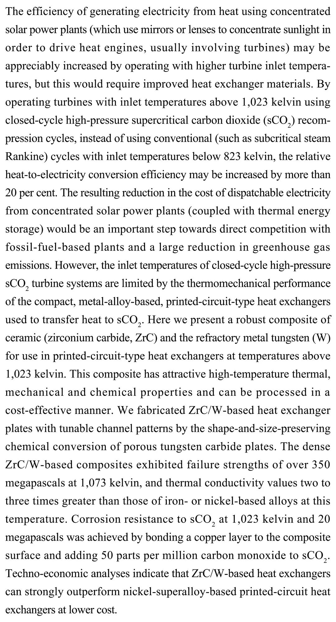 (导读 阿金)使用太阳能集中发电时,增加涡轮进口温度,可有效提高热能发电效率,因此改善热交换材料是关键。本研究报道一种稳健的陶瓷(ZrC)-金属(W)复合材料,可保证打印回路型热交换器在1023 K高温下正常运行,并保持优异的热学、力学和化学性能,同时具备抗sCO2腐蚀性能。表明该材料比Ni基超级合金具有更大的优势。
