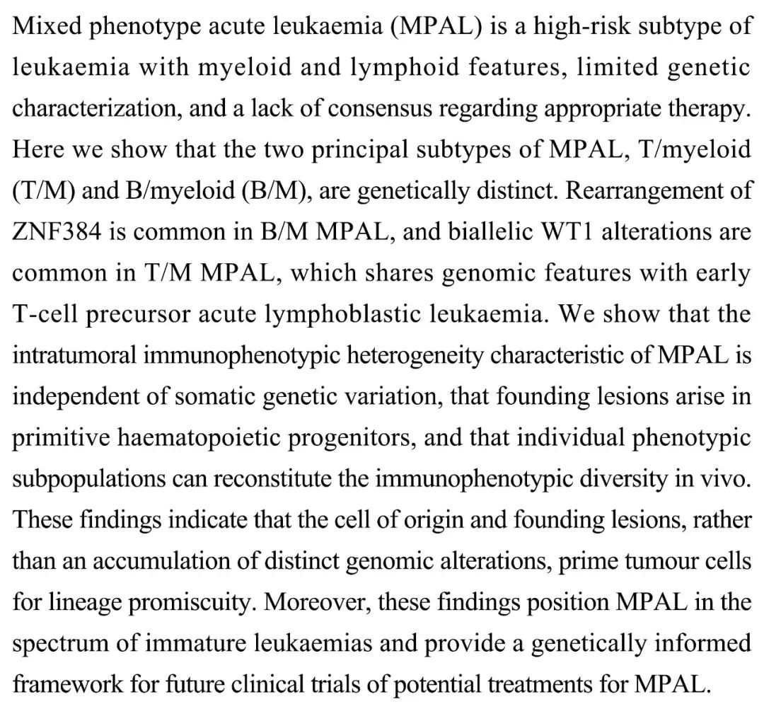 The genetic basis and cell of origin of mixed phenotype acute leukaemia