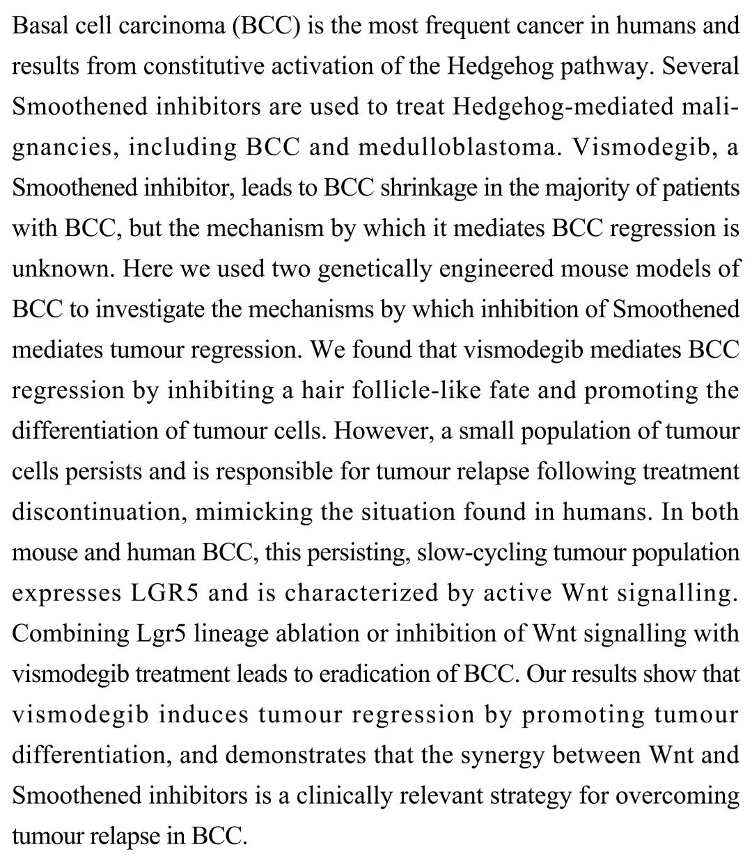 (导读 阿金)Vismodegib作为Smoothened抑制剂用于治疗基底细胞癌(BCC),但尚不清楚其作用机制。本研究使用基因工程BCC小鼠发现vismodegib通过抑制毛囊样细胞命运和促进肿瘤细胞分化介导BCC消退,但在治疗后一群表达LGR5,wnt信号通路激活的慢速更新肿瘤细胞持续存在导致肿瘤复发。将去除Lgr5细胞或抑制Wnt信号与vismodegib治疗结合可根除BCC。该研究结果为抑制BCC复发提出了一种组合治疗策略。