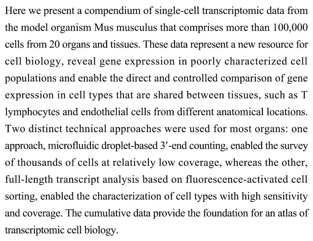 (导读 郭怿暄)本研究对来自小鼠20个组织器官的10万多个细胞进行单细胞测序建立了Tabula Muris数据库。测序应用两种方法:高通量、低覆盖的基于微流体液滴的3‘端计数以及高灵敏度和覆盖率的基于荧光激活细胞分选的全长转录分析。该数据库资源可用于研究罕见细胞的基因表达,不同组织间同类型细胞基因表达的比较,为绘制细胞生物学的转录图谱奠定基础。