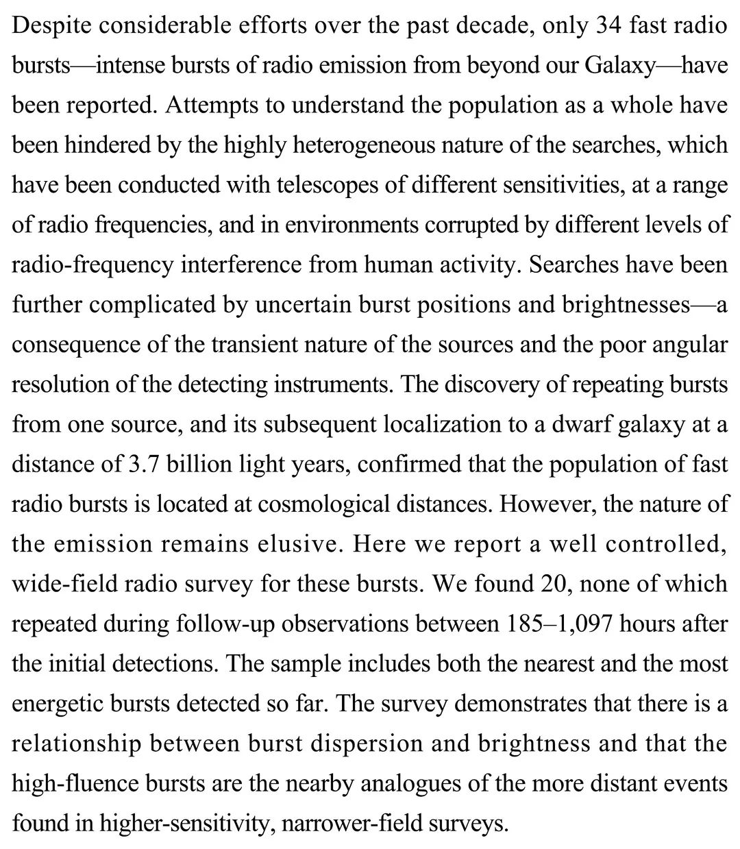 (导读 雷鸣)过去10年报道过的快速射电暴(FRB)只有34次,因爆炸位置和亮度的不确定性,使得搜寻工作愈加复杂。本研究对FRB进行了控制良好的广域探测,发现20次FRB,在观测后185 - 1097小时后均没有重复发生,其中包括迄今距离地球最近及爆炸能量最高的两次FRB。研究表明,FRB色散和亮度之间存在一定关系,高通量暴发与在高灵敏度、狭域探测中发现的远距FRB相似。