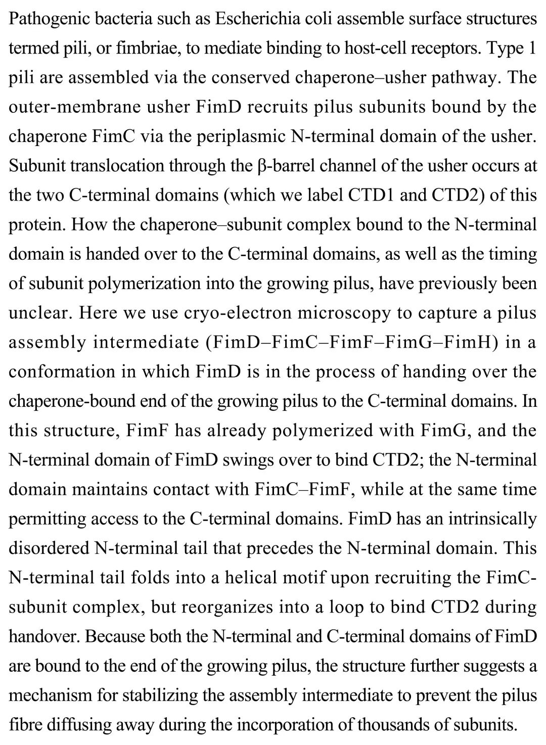 (导读 郭思瑶)细菌1型菌毛组装过程中,与分子伴侣FimC结合的菌毛亚单位首先与细胞外膜上引领蛋白FimD位于周质侧的N端结构域结合,再被转移到FimD的C端结构域,并组装为菌毛。研究者利用冷冻电镜捕获了大肠杆菌菌毛组装中间体FimD–FimC–FimF–FimG–FimH的结构,该中间体结构展示了各亚基由FimD N端转移至C端,并逐渐组装为多聚体的一个时间节点,揭示了各亚基转移和组装的分子机制。