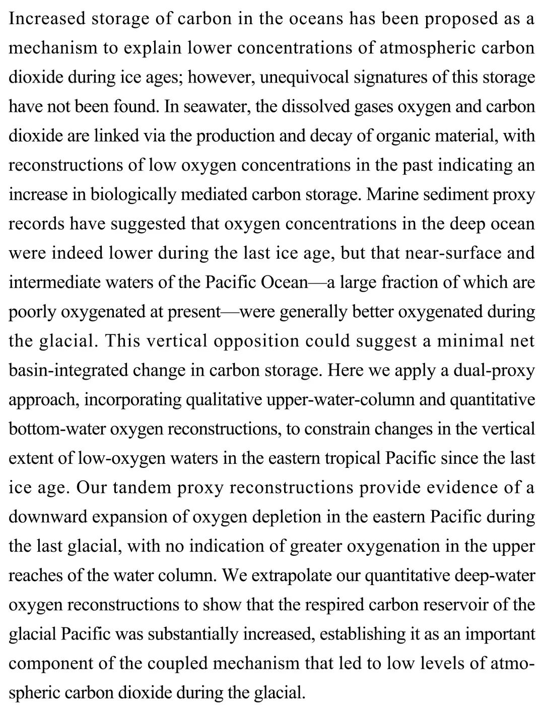 (导读 阿金)海洋碳储量的增加是解释冰期大气二氧化碳浓度降低的机制。本研究使用双重代理法,结合定性上层水体和定量下层水氧重构,证据表明上一次冰期太平洋东部的氧消耗向下扩张,同时没有迹象表明水体上层氧化更强。结果说明冰期太平洋呼吸性碳储存明显增加,导致当时大气二氧化碳含量较低。