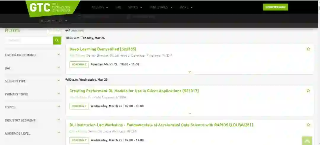 您也可以根据时间、类型、主题、行业、难度等维度筛选适合您的内容分享,包括网络直播研讨会、DLI 深度学习学院培训,以及与技术专家连线环节。数百个线上干货议程任你挑!