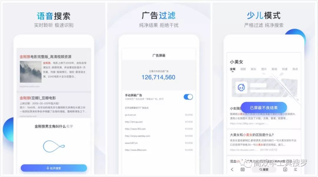 它支持文字搜索,语音搜索,图像搜索。同时还能过滤广告,页面加载更快速。