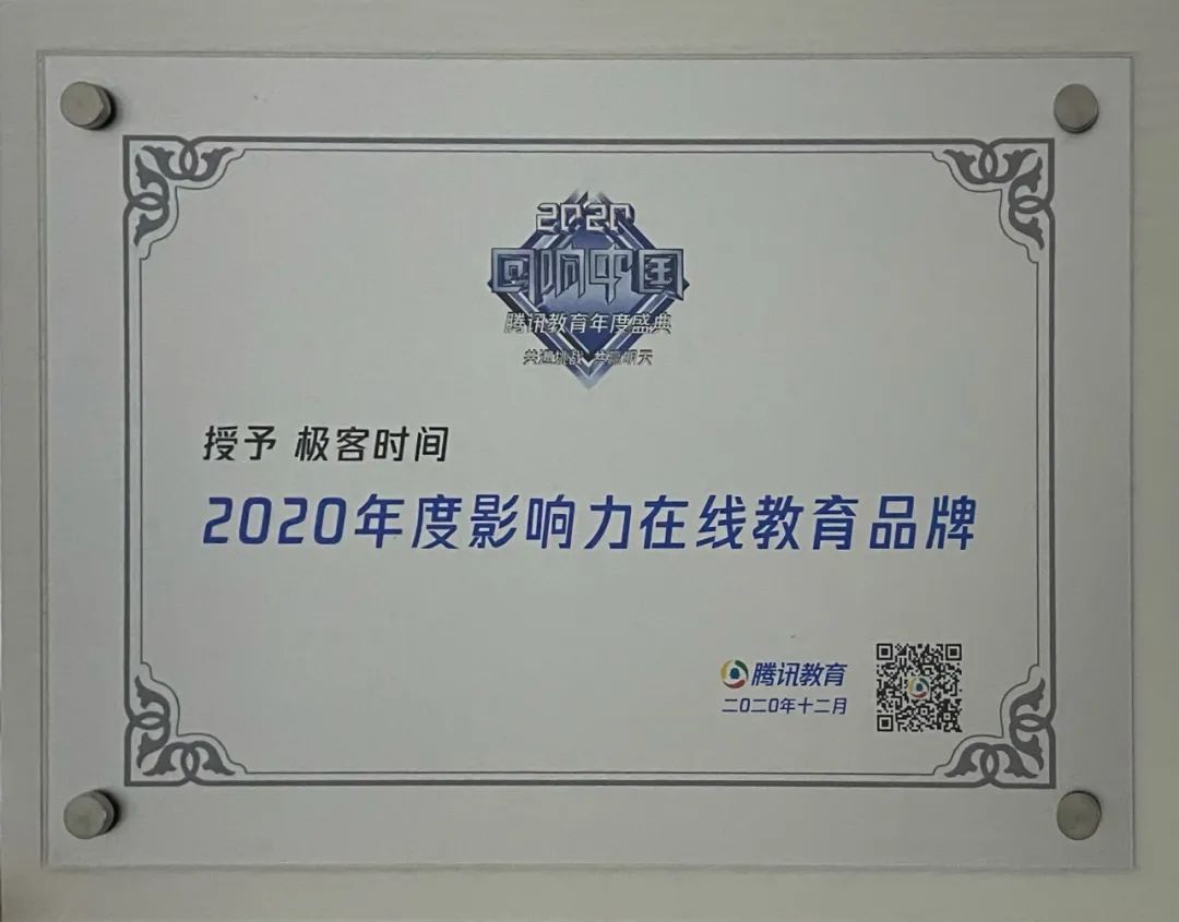 12 月 2 日, 2020 “回响中国”腾讯教育年度盛典在中国大饭店隆重举行。极客时间荣获「2020 年度影响力在线教育品牌」。