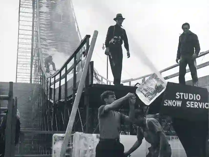 其实,如魔法一般漫天喷洒雪花的造雪机诞生于电影业。1934 年,华纳兄弟技术总监 Louis Geib 在伯班克(Burbank)发明了第一台造雪机原型,由三个旋转的叶片和一个大功率的风扇组成。这些叶片可以从 400 磅的雪块上刨冰,而大功率的风扇可以把产生的冰雪颗粒吹到空中。