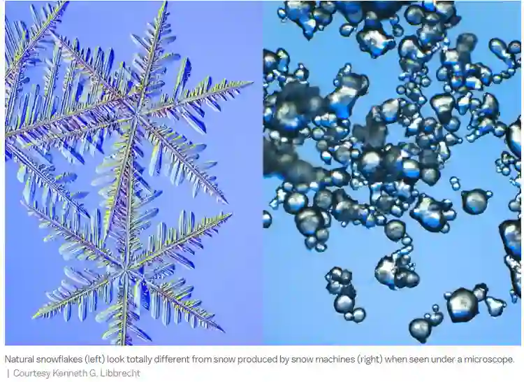 物理学家 Ken Libbrecht 在接受Vox采访时说,自然降雪在开始结晶时是只有几微米宽的一个小水滴,它像空气中的一粒灰尘一样围绕着一个核形成。雪花通常需要大约一个小时才能从内到外生长,因为它的核心吸收了周围空气中的水蒸气,形成了完美对称的六边形。机械制造的人造雪则是瞬间冻结的,不是在大气中自然生长。因此天然降雪只有 5%-10% 的冰,空气的比例占到 90%-95%。而人造雪中有近 30% 的冰和 70% 的空气,表面也更加粗糙和坚硬。这种特点可能会对运动员带来更多挑战。