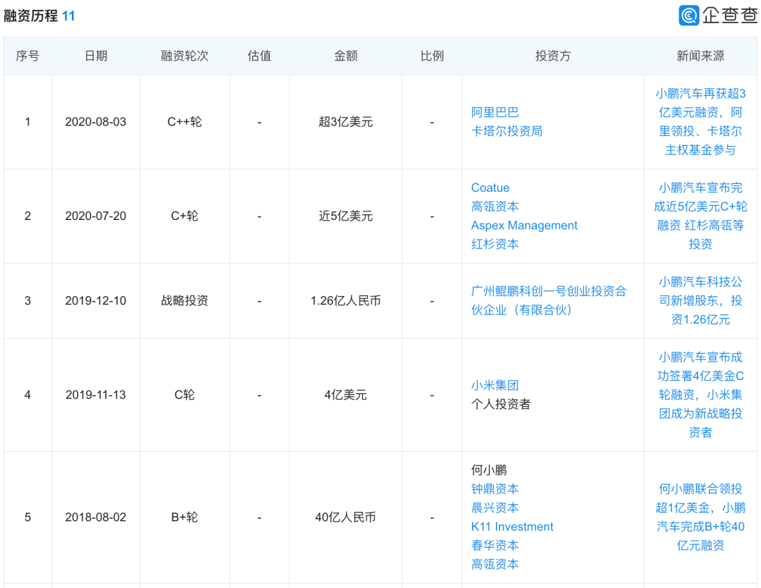 例如在今年7、8月进行的C+和C++轮融资中,小鹏汽车公募集资金近9亿美元,投资方就有阿里巴巴、高瓴资本和红杉中国等,投后估值为80亿美元。去年11月,小鹏汽车C轮融资4亿美金,引入战略投资小米集团。