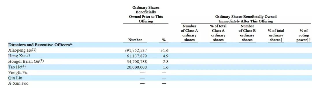此次小鹏汽车提交的招股书中显示,小鹏汽车联合创始人何小鹏持股比例为31.6%,为小鹏汽车最大股东;小鹏汽车联合创始人、总裁夏珩持股比例为4.9%;高管和董事共计持股40.9%。