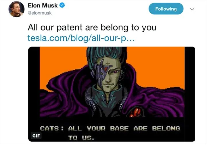 马斯克宣布对外开放特斯拉所有专利(来源:twitter)