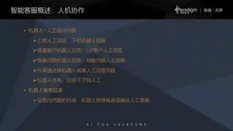 当然并不限于我们在这里举出的这几个例子,还可以根据业务需求,定制复杂策略:机器人推荐答案给人工,人工客服来选择和编辑答案、或者给出另外一个答案,机器人在这里起到了一个人工客服小助理的角色,这也是最常见的人机协作方式。