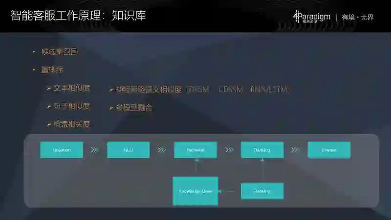 第二是重排序,其实我们可以用文本相似度、检索相关度,如果有足够数据的话,还可以用神经网络的语义相似度等,来做重排序工作。这些工作也可以用多模型融合的方式来做,将多个模型的结果综合考虑得到最终结果。这些都跟搜索引擎的技术没有特别本质的区别,也会有些微小的差别,这是知识库这块的工作。