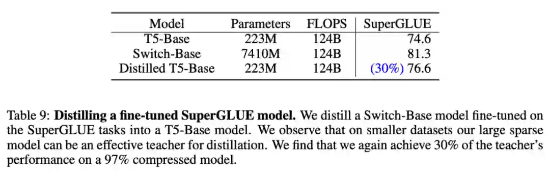 最后,研究者将微调稀疏模型蒸馏为稠密模型。下表 9 展示了对 74 亿参数 Switch-Base 模型(该模型针对 SuperGLUE 任务进行了微调)的蒸馏结果——223M T5-Base。与预训练结果类似,蒸馏后的模型仍保留 30% 的性能提升。这可能有助于确定用于微调任务的特定专家并进行提取,从而获得更好的模型压缩。