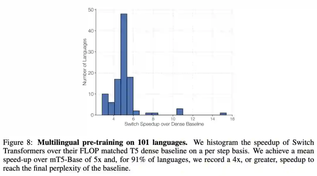 下图 8 展示了 Switch Transformer 相较 mT5-Base 的每一步加速情况,前者实现了平均 5 倍的加速,其中在 91% 的语言上实现了至少 4 倍加速。这表明 Switch Transformer 是高效的多任务和多语言学习器。