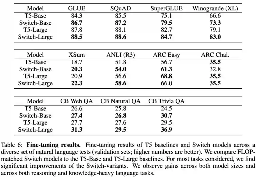 整体而言,Switch Transformer 模型在多项推理和知识任务中带来了显著性能提升。