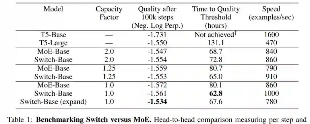 Switch Transformer 与 MoE Transformer 的比较结果如下表 1 所示。结果表明,Switch Transformer 在速度 - 质量(speed-quality)基础上优于精心调整的稠密模型和 MoE Transformer,并在固定计算量和挂钟时间情况下取得了最佳结果;Switch Transformer 的计算占用空间比 MoE Transformer 小;Switch Transformer 在低容量因子(1.0, 1.25)下表现更好。