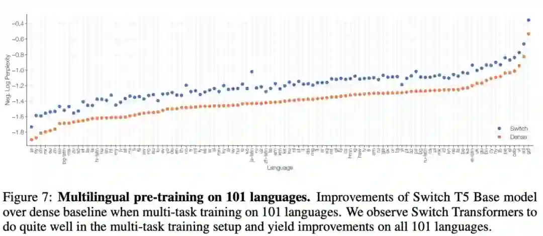 在下游任务实验中,研究者衡量了模型质量和速度的权衡,模型在 101 种不同语言上进行了预训练。下图 7 展示了 Switch T5 Base 模型与 mT5-Base 在所有语言上的质量提升情况(负对数困惑度)。对两个模型经过 100 万步预训练后,Switch Transformer 的最终负对数困惑度相较基线有所提升。