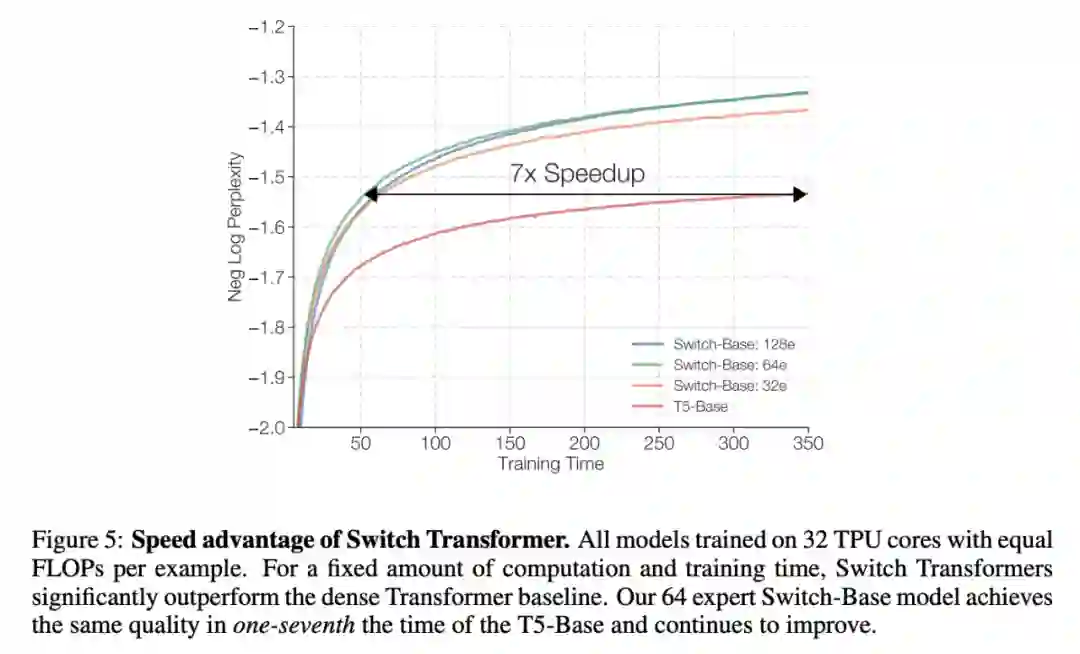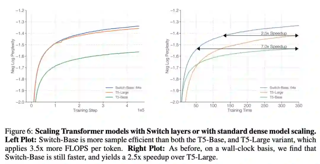 如上图 4 所示,随着专家数量的增加,模型的性能会不断提升。虽然模型的每个 token 拥有与基线近乎相同的 FLOPS,但 Switch Transformers 会产生额外的跨设备通信成本,路由机制也会带来额外的计算开销。因此,在基于步数的设置中观察到的样本效率提升未必能转化为时间上的模型质量提升。这就引出了一个问题: