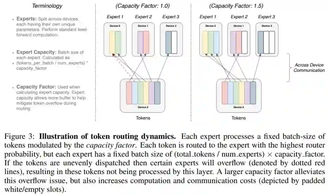 下图 3 展示了具有不同专家容量因子(expert capacity factor)的路由示例: