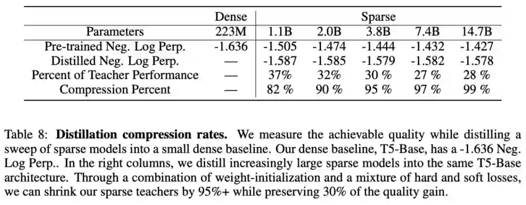虽然无法完整维持万亿参数模型的质量,但通过将稀疏模型蒸馏为稠密模型,可实现 10-100 倍的压缩率,同时获得专家模型约 30% 的质量改进。
