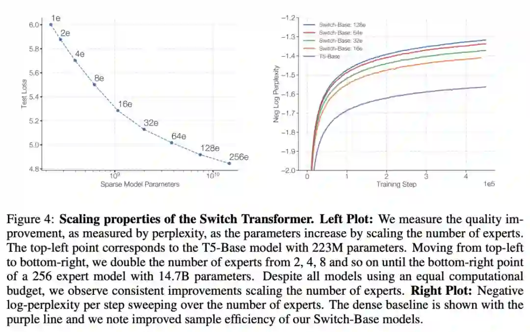 下图 4 展示了多个模型在训练步数恒定、专家数量增加时表现出的可扩展性提升情况。从中可以观察到一个趋势:在保持每个 token 的 FLOPS 不变时,拥有更多的参数(专家)可以提高训练速度。
