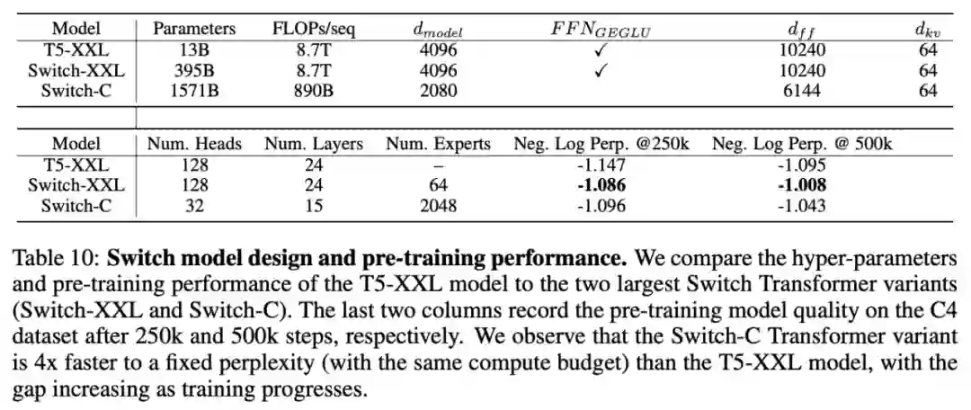 实证研究发现,将丢弃的 token 比例保持在较低水平对于稀疏专家模型的扩展很重要。设计决策对模型质量和速度的影响参见下表 1。