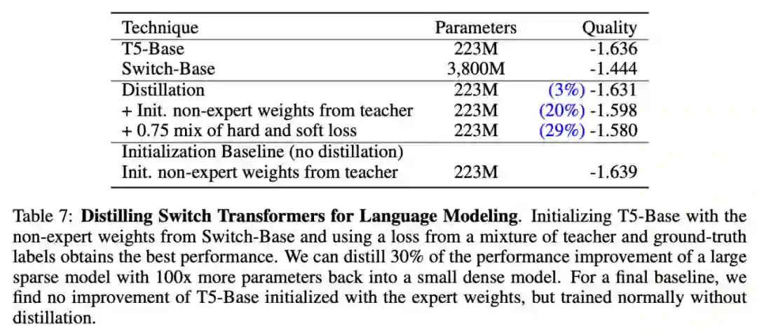 研究者还表示,虽然这项工作着眼于规模,但它也表明,Switch Transformer 架构不仅在具备超级计算机的环境下具有优势,在只有几个计算核心的计算机上也是有效的。此外,研究者设计的大型稀疏模型可以被蒸馏为一个小而稠密的版本,同时还能保留稀疏模型质量提升的 30%。
