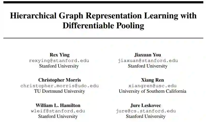 推荐理由:这篇文章的想法很新颖,它的任务对对整体的图结构进行分类,为了得到全局的特征,它设计了一个层次化的图神经网络来逐层提取特征。本文提出了可微分池化的思想,对于每层神经网络得到的表达,它用学习的方式学出一个池化矩阵,并用该矩阵对每层得到的表达进行池化操作。