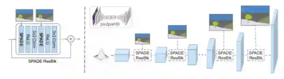 在SPADE生成器中,每个归一化层都使用分割掩模来调节该网络层的激活状态。(左)一个SPADE残差结构。(右)该生成器包含一系列SPADE残差块和上采样层。