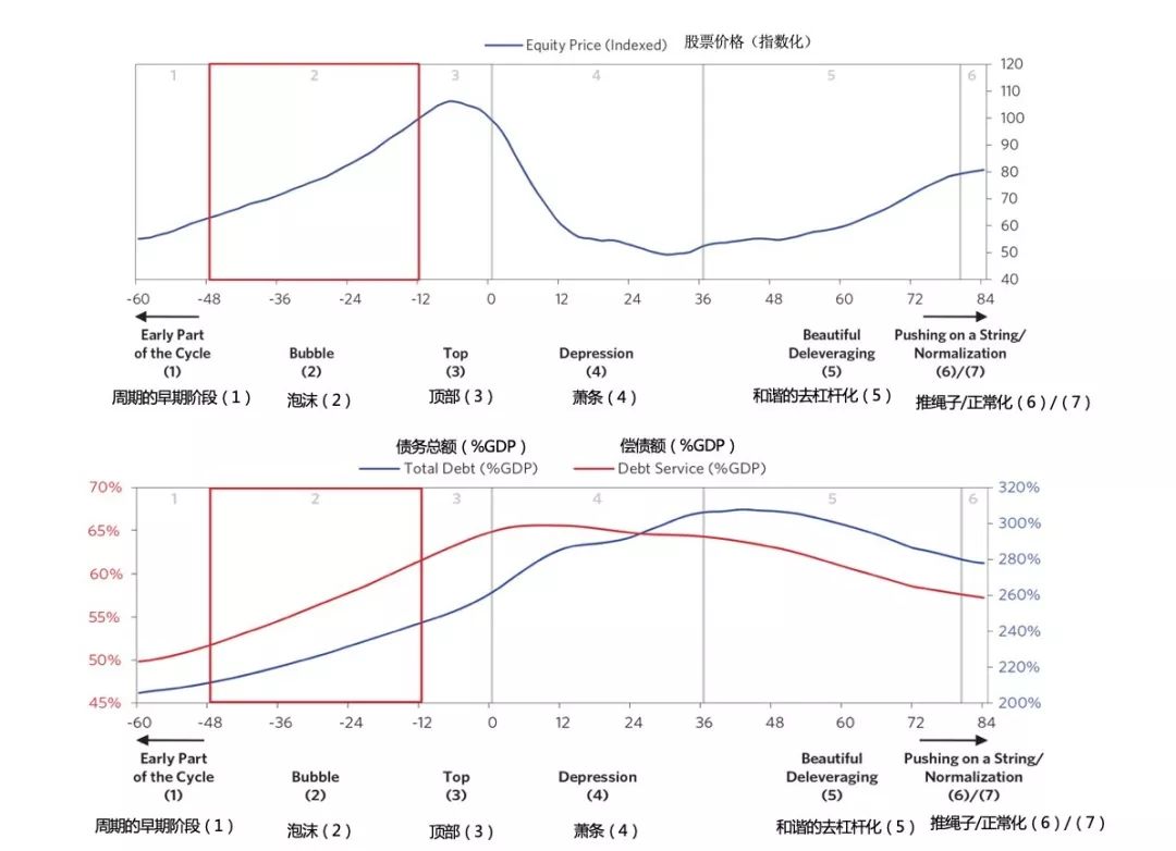 在泡沫期就可以看到股价在上升,这是整体的债务情况,我们可以看到股价的上升,然后到泡沫见顶的时候就看到收紧。