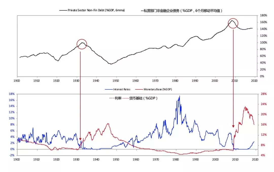 然后我们可以看到在2008年美联储是这样做的,债务占GDP的比例非常高,利率几乎是0,然后央行开始印钞,购买金融资产,开始扩表,央行购买了15万亿的金融资产。