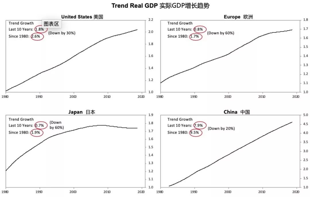 这是美国过去10年的生产效率。从20世纪80年代开始的生产效率的变化,欧洲的生产效率在下降,下降了60%,从0.6到1.8。日本的生产效率在下降,它的债务危机在发展,社会进入老龄化。