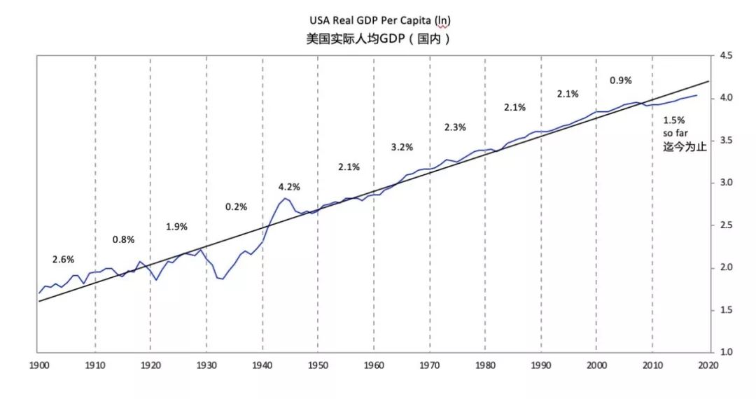 我给大家介绍几个图表,这个线是美国从1990年开始的人均GDP,我们可以看到这个上段线条力量是非常大的,它会有波动,但是这些波动、这个周期是非常长期的。