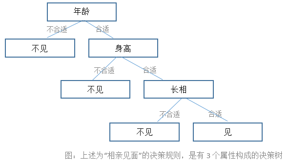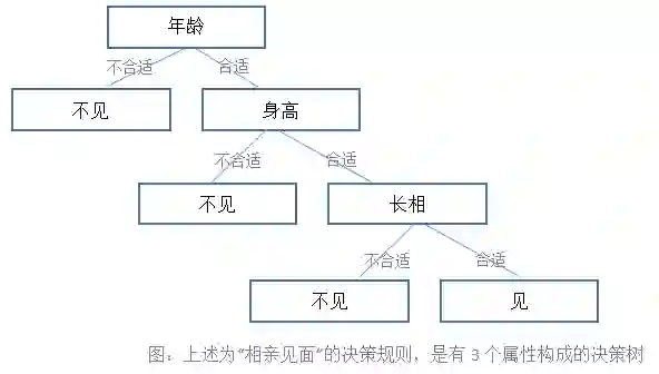 决策树一种经典的机器学习分类算法,主要的代表算法有ID3、C4.5、CARD,原理可以简单理解为通过对数据总结、归纳得到一系列分类规则,举个简单的例子: