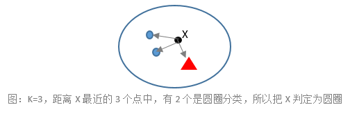 KNN(K最近邻分类算法)是一种在机器学习中比较简单的算法,它的原理如下:对于一个需要分类的物品A,定义某一种刻画物品之间距离方法,找出该物品最邻近k个有已知类别的物品,这k物品中出现最多的类别即为物品A的类别。如下图: