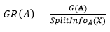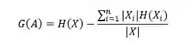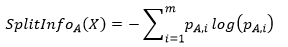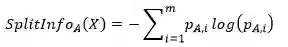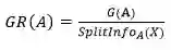 表示的意思是属性A的复杂度,该公式除了考虑系统纯度的增量的同时,也考虑了属性A的复杂度。该值越大表示裂分方式使得系统更为有序。(在ID3算法中,由于选择的是信息增益计算系统纯度增量,往往会选择复杂度高的属性进行裂分,复杂度高的属性取值分段会有很多,导致裂分后某些节点只有少量样本而不具备用于预测的统计意义,C4.5基于这个问题加以改进)。