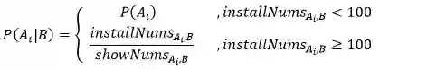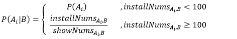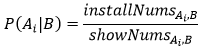 参数集合{P(Ai|B)|B∈I,Ai∈I}给定一个应用B及Ai 根据表1,首先计算“Ai∈已安装列表”且“展示应用=B”的样本数,记为showNumsAi,B . 然后计算“Ai∈已安装列表”且“展示应用=B”且“用户是否安装=1”的样本数,记为installNumsAi,B 那么:
