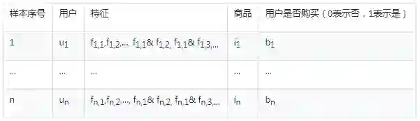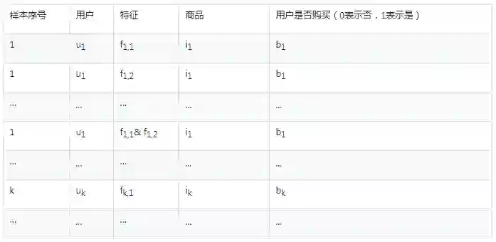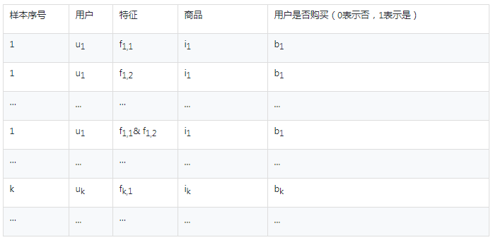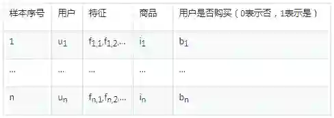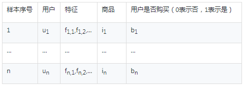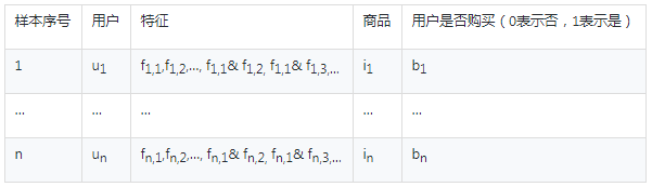 首先收集用户展示购买记录,并且关联用户在展示时刻的特征数据。设总样本数量为n条,数据格式如下: