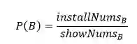 参数集合{P(B)|B∈I}的计算:给定一个应用B. 根据表1,首先中“展示应用=B”的样本数,记为showNumsB然后计算“展示应用=B”且“用户是否安装=1”的样本数记为installNumsB 那么: