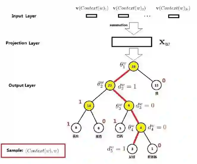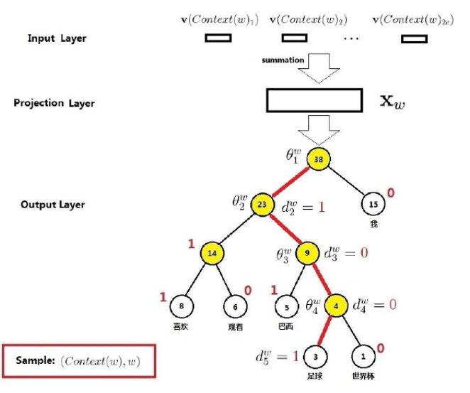 哈夫曼树中的每个节点都是一个逻辑斯蒂回归函数,以输出的词作为叶子节点路径中的每个节点的分类(路径走左分支为1,右分支非0)作为训练目标。例如:上图中输出词假设为“足球”,那么路径如下: