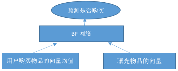 模型的输入有两个,第一个为用户历史购买物品的向量均值,第二个为曝光物品的向量。模型的输出为用户是否购买曝光的物品,中间用BP网络进行连接。