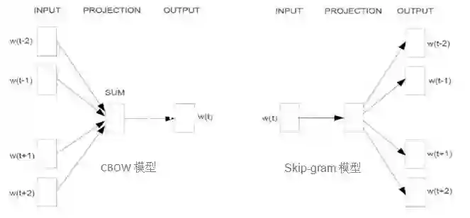 W2V有两种模型,一个是CBOW模型,另一个是Skip-gram模型。两个模型都是对词进行向量化,区别在于:CBOW是以一个词为输出目标,以该词邻近的词为输入;Skip-gram是以一个词为输入,以该词邻近的词为输出目标。示例如下: