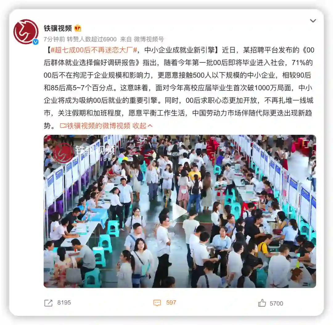 刚好第二天,就在微博看到这样一个话题 #超七成00后不在迷恋大厂# ,71%的00后更愿意接触500人以下规模的中小企业。