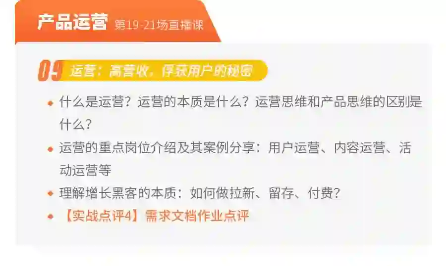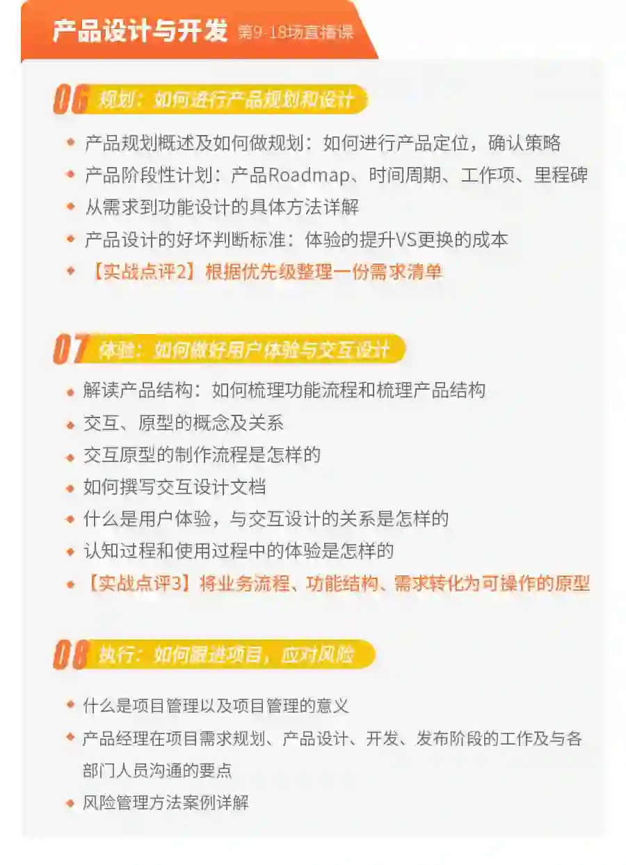 课程以6个产品知识核心作为主体,它们分别是:解构产品经理、行业与竞品分析、需求挖掘与分析、设计开发与项目执行、产品运营、产品进阶与就业指导。