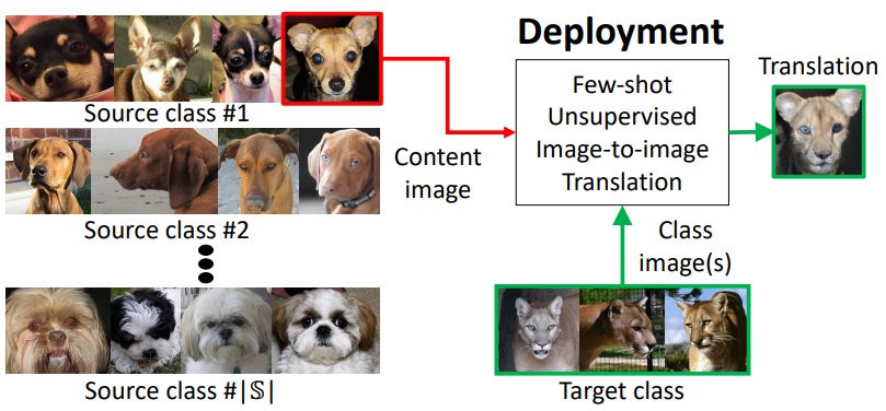 然而要让模型跨类转换图像,就没有那么容易,英伟达&康奈尔大学使用的FUNIT模型的图像生成任务如下: