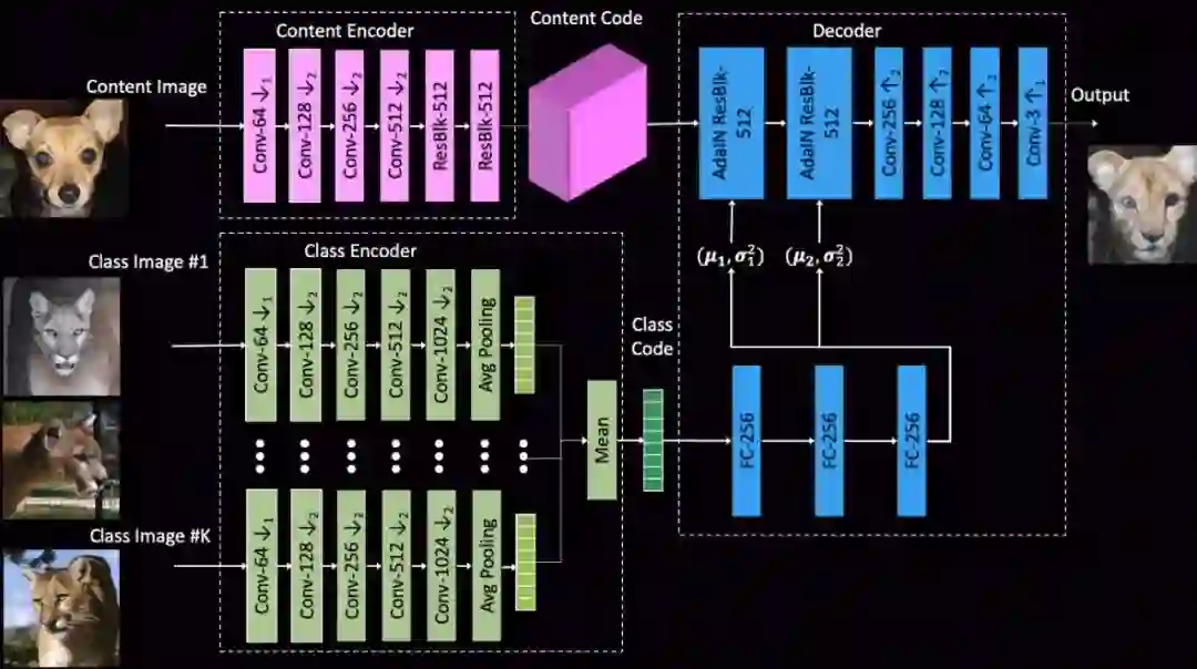 随意抽取一张原内容图片(Content image), 同时给出你想要转换到的目标类别(Target class),最后,需要由模型把原图片转换成目标类别的独特属性。如果你有一张小狗的图片,模型可以为你联想这只小狗“进化”成狮子会是什么样?