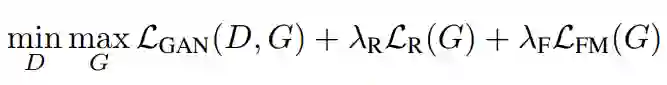 其中3项分别表示GAN的loss图像本身构图的loss, 以及特征匹配的loss 。